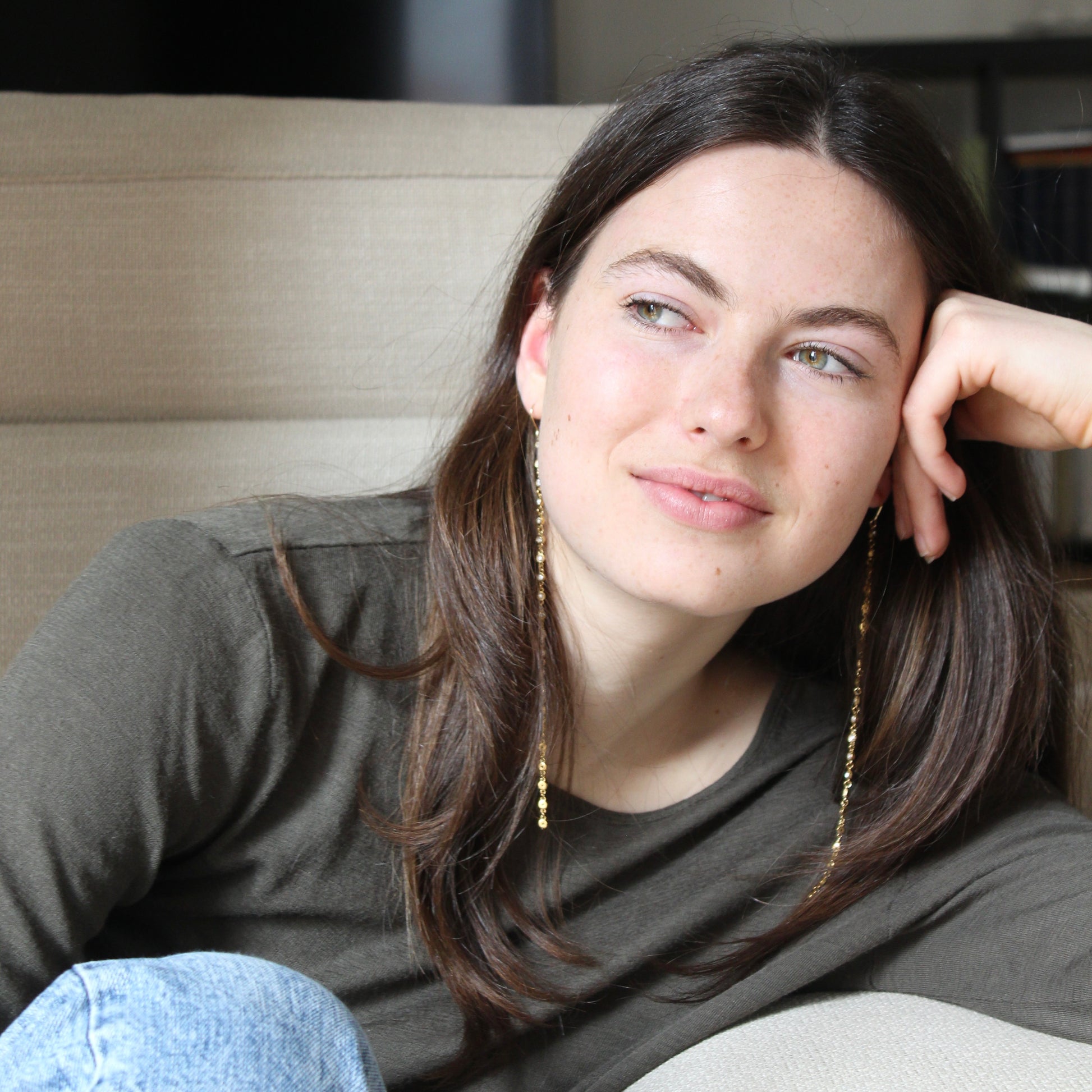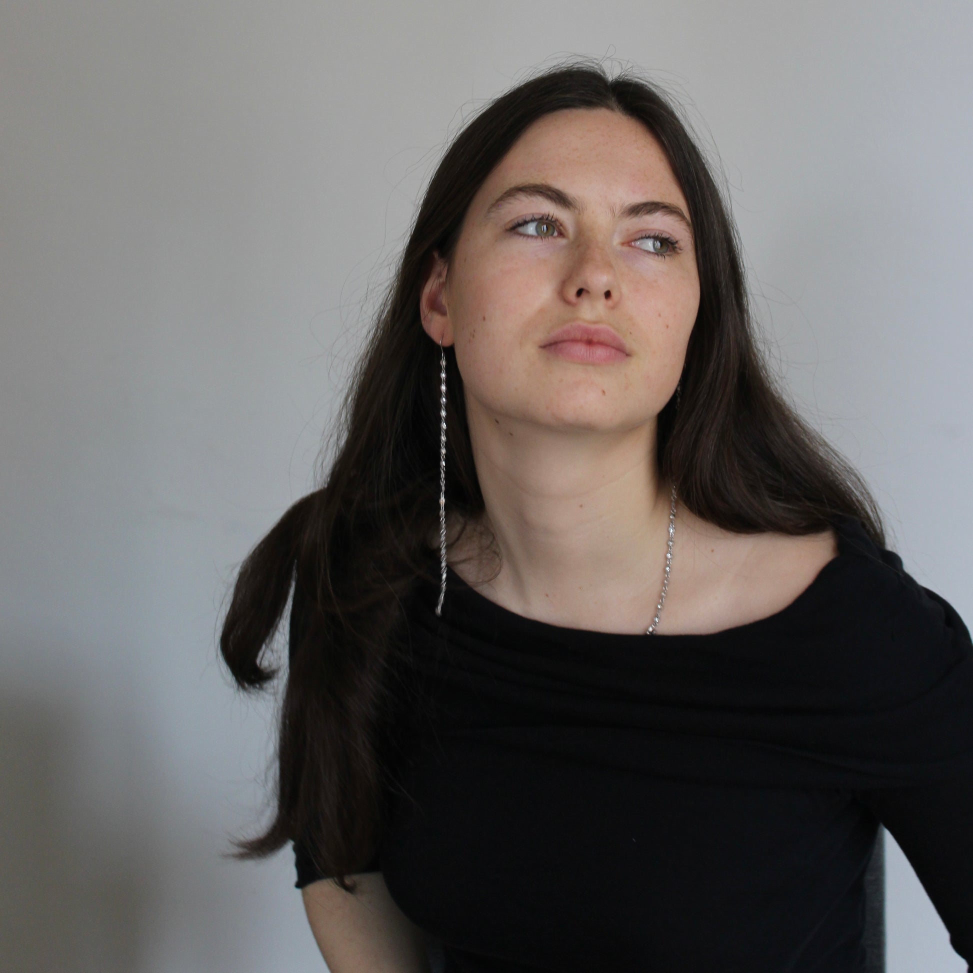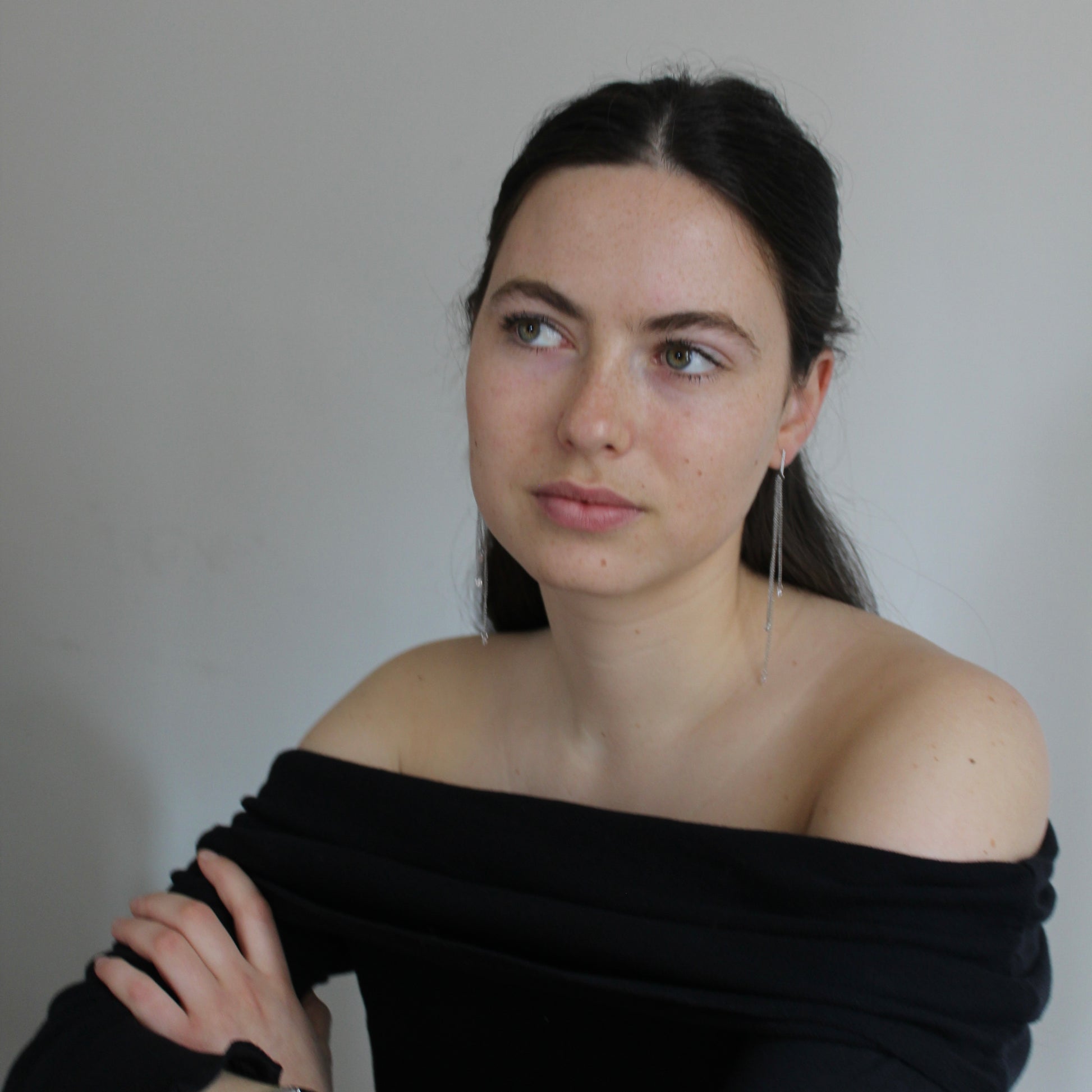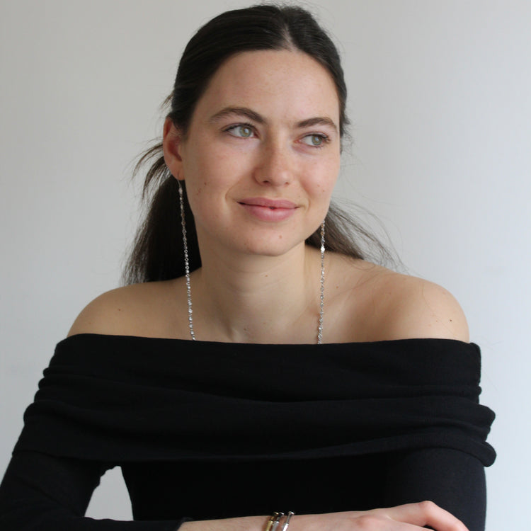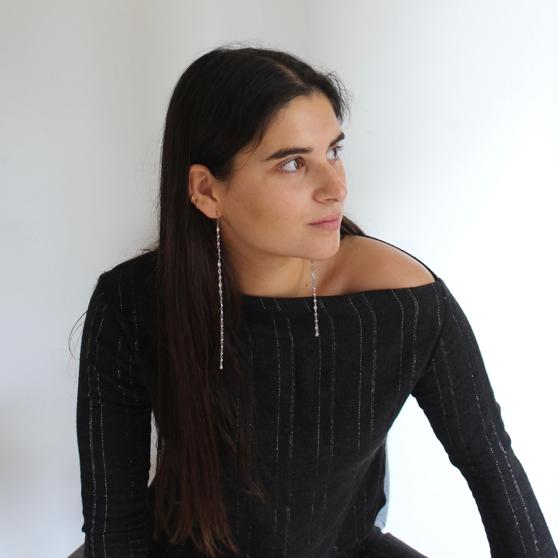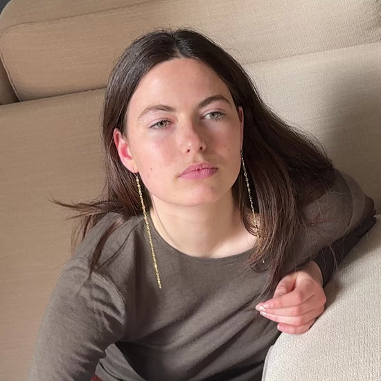 Los pendientes RAY están pensados para captar la luz en cada gesto. Una cadena fina de circonitas que cae suavemente desde la oreja hasta más allá de la clavícula, creando un efecto alargado, elegante y muy especial.